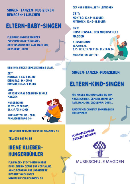 Melden sie sich dafür bei unserer Kursleiterin Irene Klieber-Hungerbühler unter Tel: 076 / 461 74 45 oder irene.klieber@musikschulemagden.ch